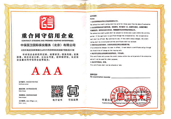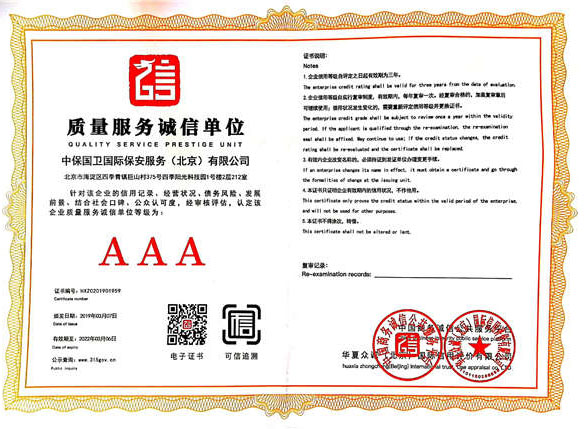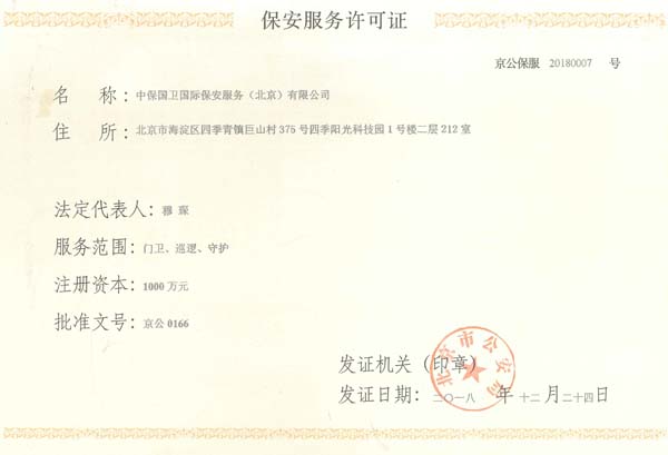 中保國衛(wèi)國際保安服務(wù)(北京)有限公司,屬中保國衛(wèi)集團(tuán)旗下子公司。能全方位的為大型客戶提供優(yōu)質(zhì)的安保、押運(yùn)服務(wù),是集人防和技防于一體的新型正規(guī)化綜合安保押運(yùn)服務(wù)企業(yè),提供人防、物防、技防、聯(lián)網(wǎng)報*、非武裝押運(yùn)等安防相關(guān)的一站式服務(wù)。 公司在國內(nèi)多省設(shè)立有分公司及分支機(jī)構(gòu),著重提升安全押運(yùn)、智能技術(shù)押運(yùn)及安全技術(shù)防范相關(guān)的服務(wù),業(yè)務(wù)范圍覆蓋全國一、二線城市、港澳地區(qū)以及海外地區(qū)。安保方面主要為政府機(jī)構(gòu)、金融機(jī)構(gòu)、企事業(yè)單位、醫(yī)療衛(wèi)生、高等院校、工業(yè)園區(qū)、大型商場、高檔住宅、智能商務(wù)樓、大型活動提供門衛(wèi)、守護(hù)、巡邏、押運(yùn)(非武裝)、安全檢查、保安特勤、私人護(hù)衛(wèi)、消防中控、安全技術(shù)防范、遠(yuǎn)洋護(hù)航等全方位服務(wù),同時面向國際市場,為中資企業(yè)在“一帶一路”沿線國家投資提供境外安保服務(wù)。 >> 更多內(nèi)容 |